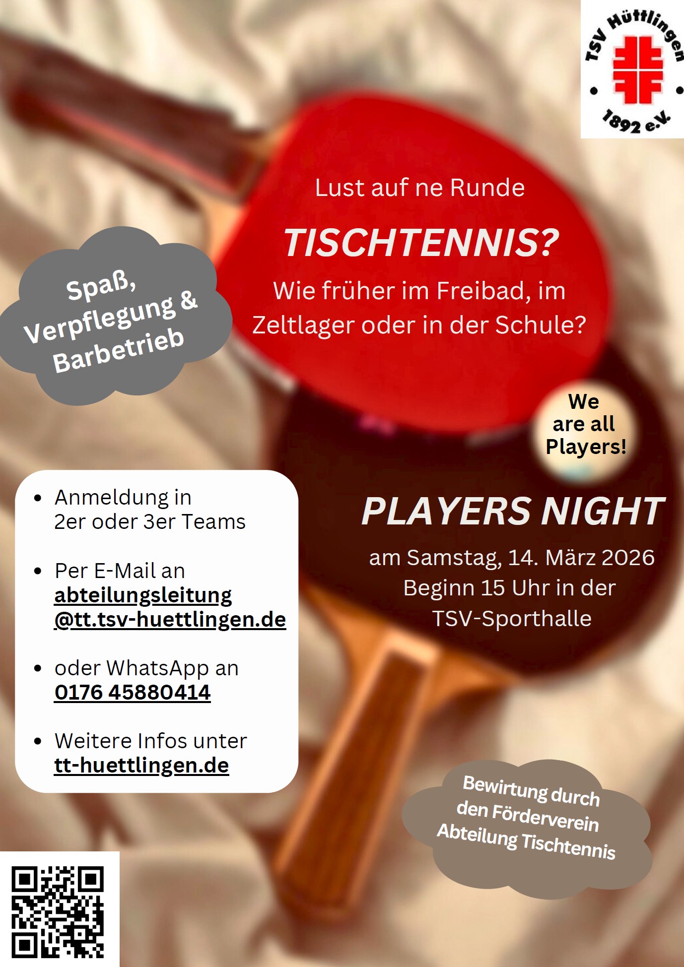 Am 14. März 2026 findet unsere diesjährige Players Night statt – ein Abend voller Spaß, sportlichem Ehrgeiz und guter Stimmung. Wir freuen uns über zahlreiche Anmeldungen und auf viele motivierte Teilnehmerinnen und Teilnehmer, die dieses Event erneut zu etwas Besonderem machen.
